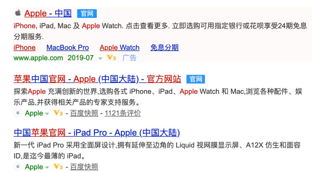 图片来源于网络,侵删 百度搜索“苹果官网”,蓝色官网标展示位置突出,便于度小信迅速关注和点击目标网站。这个蓝色的小“官网”蓝标就是百度的官网认证。官网认证是百度对客户主体资质及主体网站在强关联关系的检索词下展示“官网”标识的增值服务认证。带“蓝官网”标识的商家链接,都是通过核实的正规企业和商家,我们想要查询某企业的具体信息时,点击这些带“蓝官网”标识的网站就不会出现错误。