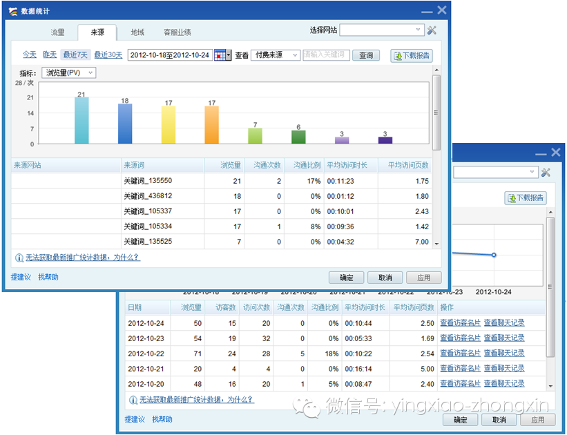 惊喜4:独家,全面,精准的营销分析依据 与百度统计共用一段代码,完成多站点多维度分析,流量、地域、来源、沟通,全方位掌控任意时段效果 通过细致分析以下几点,您可以不断优化营销过程,提升ROI! 哪个环节流失多?具体原因是什么? 具体哪个付费关键词咨询更多?哪个地区转化更好? 哪些自然搜索词咨询增长快?可能是市场潜在机会!