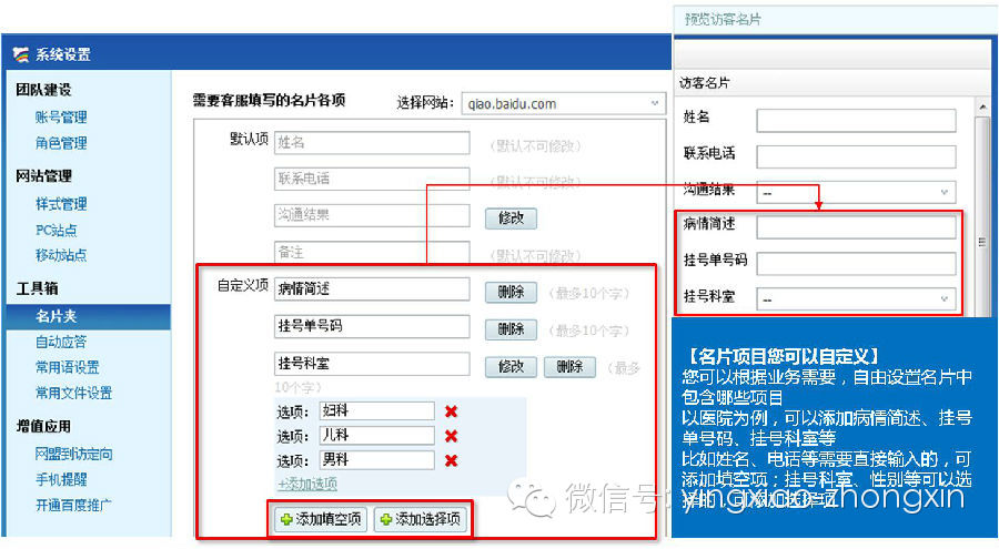 您希望名片中都包含哪些信息,可在系统设置-名片夹中添加,下次客服即可按照您定义的项目来填写名片了