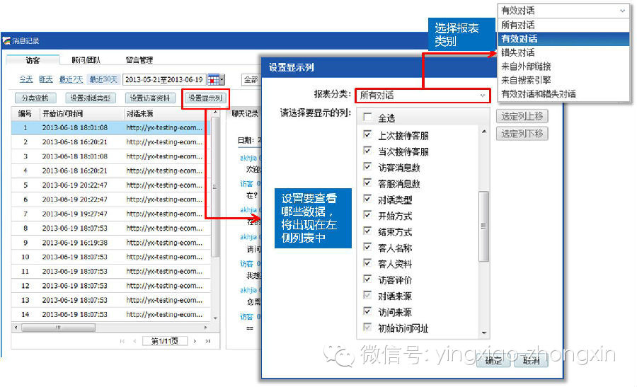 每条对话的背后,包含非常丰富的信息,您可以点击“设置显示列”来选择需要出现在左侧列表的内容