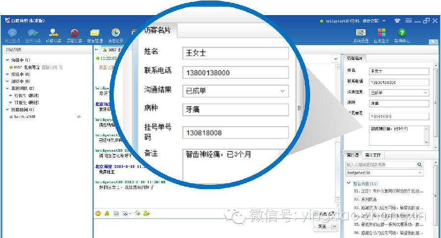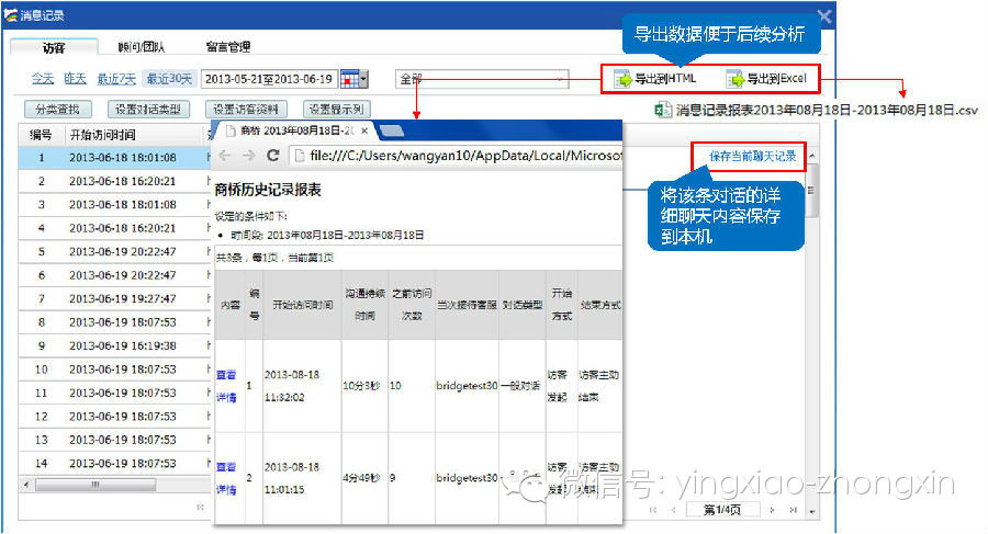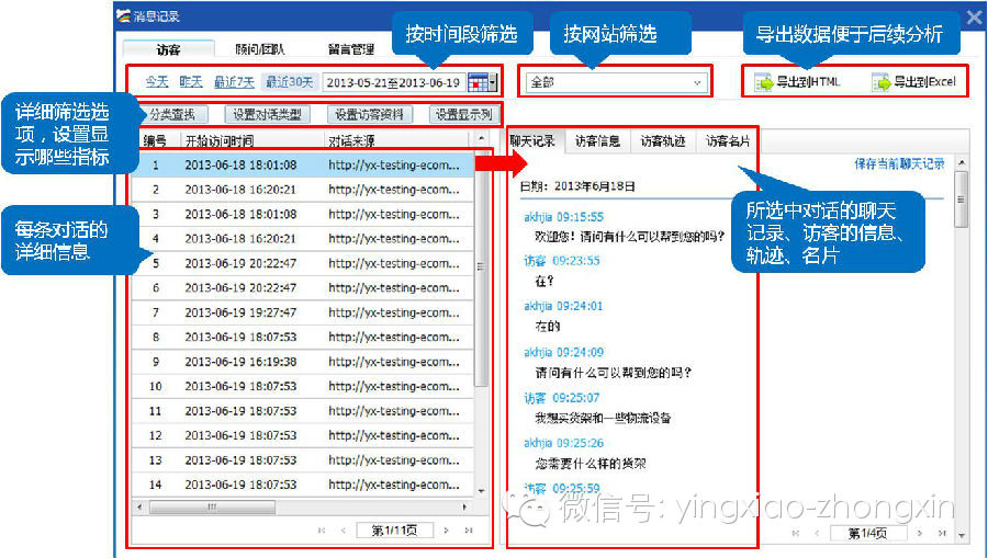 2、 细致分析消息记录,最大化挖掘访客潜在价值 消息记录中,您可以查看每条对话所对应的具体内容、访客完整信息、访客名片