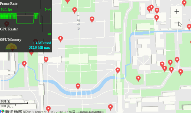 充分发挥GPU的并行计算能力,同时结合WebWorker多线程技术,大幅度提升了大数据量的渲染性能。最高支持百万级点、线、面绘制,同时可以保持高帧率运行。