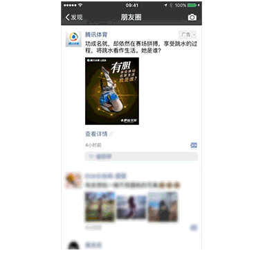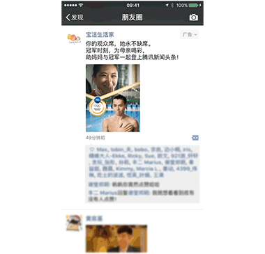 作为首发品牌,NIKE的广告表现十分突出。页面停留时长为平均水平的4倍,点赞评论高于行业平均水平。此外,优秀的创意和产品形式带来了用户自发分享:NIKE广告分享后带来的二次曝光高达200多万次。 同样使用原生推广页广告呈现创意的,还有三星、腾讯新闻等,在广告停留时长与社交互动方面,均表现出色。原生推广页广告在社交场景与商业内容间无缝衔接,广告体验提升至新的层次。 紧追赛程,把握黄金投放时机 追热点什么最重要?Timing! 在跳水队为中国赢得第二金后,宝洁 “冠军背后的母亲” 主题广告随即在朋友圈上线,把握住了热点营销的最佳时机。本次奥运营销,宝洁延续了 “母爱” 主题,继续以情动人,广告创意内容与跳水比赛的强关联性吸引了用户点击和讨论,朋友圈外层图片点击率为行业均值的2倍,视频播放完成率为平均水平的3倍。