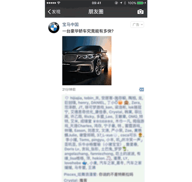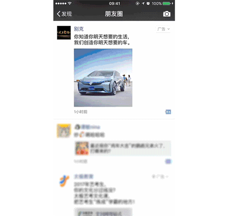 奥迪朋友圈广告创意示意 过去新车发布会通常只有合作伙伴和媒体能参加,现在借助直播技术,再加上朋友圈广告的强势覆盖,传播声量几何倍数放大,更好地实现了短时间大量曝光的营销诉求。 最终,超过80%的朋友圈广告点击用户观看了直播,使朋友圈广告成为奥迪此次新车上市直播导流最多的媒体渠道。这也是奥迪第三次通过朋友圈广告投放新车上市直播,连续投放就是广告主对营销效果最大的认可。 — 借势型老司机 — 借势是一种事半功倍的营销手段,在热点事件期间,借助相关话题热度投放朋友圈广告往往能够收获更好的广告效果。 每年三大车展是汽车行业的大事件,车展期间投放朋友圈广告,能够有效借势提升推广效果,并与品牌线下营销活动形成联动。官方数据显示,2016年广州车展期间,汽车广告主投放效果较常规时间提升明显:点击率提升1.27倍,点赞率提升2.11倍,评论率提升2.63倍,关注率提升2倍。