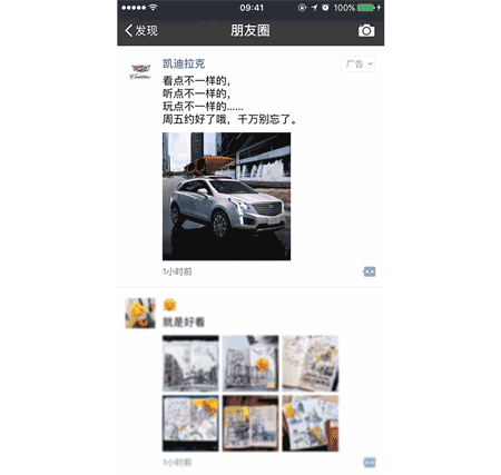 凯迪拉克:全屏沉浸,感受“敢创”精神 有时,一个优秀创意需要更多的空间来实现。 2016年8月,我们推出了朋友圈原生推广页广告,极速加载、全屏沉浸式体验、多媒体展现形式,极大拓展了朋友圈广告的创意展示空间。 凯迪拉克在新车型XT5上市时就选择了朋友圈原生推广页广告,以“周五探奇”为主题,借助语带玄机的外层文案吸引用户点击。原生落地页通过全屏视频及长图片的沉浸式体验,详尽展示了新车型亮点,传递出与XT5新美式都会 SUV 车型定位相符的“敢创”精神。 凯迪拉克朋友圈原生推广页广告创意示意 此条朋友圈广告总曝光次数超过1亿,总曝光人数达4500万,为凯迪拉克带来了高于行业平均水平20% 的互动率。 — 技术型老司机 — 汽车品牌一向走在营销趋势前沿,很多新的营销理念和技术手段都率先出现在汽车品牌营销中,往往给营销圈带来惊喜。 梅赛德斯-奔驰:全景VR科技体验,助力奔驰新车智能营销 全新梅赛德斯-奔驰长轴距E级车上市,率先在微信朋友圈尝试VR视频创意营销。 借助朋友圈广告,奔驰将全球最智能的行政座驾与当前最火的VR技术结合,不仅是一次非常前沿和大胆的尝试,更是将产品的智能属性体现得淋漓尽致。