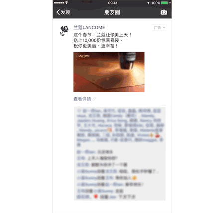 保时捷 以胆识突破全景局限,让极速体验一往无前 保时捷在春节前夕投放视频原生推广页广告,推广其新上市的Panamera 行政加长版车系。沿袭一贯的不凡气质,其广告内外层皆秉持尊贵质感,充分展示新车型将“商务空间与互联科技融入一部保时捷当中”这一最大亮点。 基于系统原生的极速加载能力,视频原生推广页能够让用户从点击外层到直接展开内层页面的动作一气呵成,零延迟的浏览体验让品牌故事也能“自然而然”。广告内层中,360度全景内饰展示,让消费者仿佛置身车中;趣味创意短视频完整展现保时捷全能的礼宾服务,让消费者印象深刻。 保时捷朋友圈广告创意示意 兰 蔻 原创生肖 IP年味儿十足,猜谜互动巧送福袋 春节前夕,兰蔻以“美上天”为主题,投放视频原生推广页广告,通过趣味猜谜活动,慷慨送出10,000个包含小黑瓶、奇迹香水在内的明星产品福袋,几乎人人有奖,诚意十足。 为赢得更多中国消费者认可,兰蔻这个法国品牌用心理解十二生肖的含义,并与其明星产品做恰当融合。广告内层中,兰蔻精心刻画的生肖折纸形象,在360全景图及短视频的烘托下跃然“屏”上,收获众多好感。此外,两个全屏视频“线索”,也带领用户逐步解谜,营造意犹未尽的浏览体验。 兰蔻朋友圈广告创意示意 星光闪闪活力满满,年货大战这样玩才有看头 在吸引消费者置办年货的春节营销战役中,伊利依托视频原生推广页广告顺畅自然的沉浸式空间,淋漓尽致地演绎 “家满活力”的创意主题,并集结旗下丰富产品线的强大代言人阵容,将“轻松力”、“成长力”、“腿脚力”等新春“十力”穿插其中,让消费者一次过足眼瘾。 广告内层中,伊利借助快闪大字报形式的全屏视频,以及360度全景视角,以祝福墙的形式完整呈现十位代言人的活力祝福,让消费者充分感受到伊利的品牌力量的同时,也忍不住采购年货,为新年的全家大小加满活力。