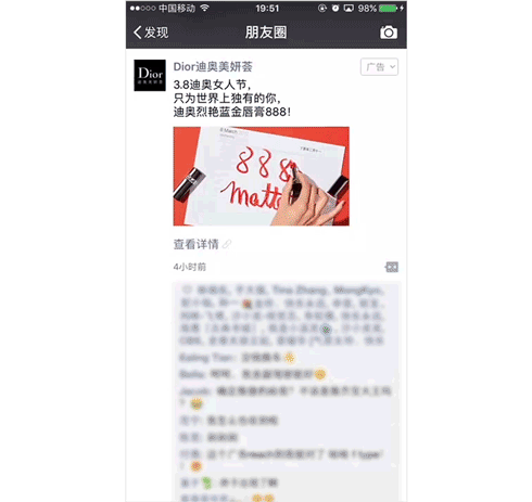 大胆创新, 转换思路带动品效提升 有时,要想广告取得好效果,也需要一些另辟蹊径的创新。 将口红广告推送给男性?看似违反常规的举动,却能收获奇效。兰蔻发现消费高端彩妆的女性很在乎“专属感”,而对男性来说,情人节正是一个好机会来满足女性这种想成为“女王”的心理需求。于是今年情人节,兰蔻推出DIY定制版专属刻字口红套装,并在投放朋友圈广告时特意增加了男性用户人群的定向——提醒男士们情人节将至,而兰蔻已为你准备好独一无二的礼物。 兰蔻朋友圈广告示意 广告投放当天就带动过千销量,同时用户对兰蔻品牌的推荐意向提升了5%,购买兰蔻产品的人数提升了14%。 一点投放思路上的创新,有效促进了品牌和销量的提升。 想玩节日营销,但节日不够用了怎么办?迪奥就为自家最知名的经典色号999号唇膏量身打造了一个“9.9红唇节”。原本就在美妆圈大名鼎鼎的“迪奥999”,借助“9.9红唇节”的概念和朋友圈广告的传播,获得了更广泛的认知度和高关注度,也为广大爱美女性创造了又一个买新口红的机会,不仅点击互动率高于行业均值,销售转化也超出预期。 在女性消费升级的浪潮下,口红这种产品备受欢迎。单品价格不高、变美的时尚利器、颜色缤纷多彩等等原因促使口红成为购买频次最高的彩妆品类。 正可谓每季新品层出不穷,买买买的兴致丝毫不减。不光是口红,任何一种女性喜爱的产品都有机会引领下一季的时尚潮流。七夕将至,双十一圣诞节也在不远处,谁将成为朋友圈中的下一季爆款? 如果您有任何问题,欢迎留言咨询微信广告助手,在线客服会及时为您解答。 客服在线时间:工作日9:00-18:00 |
