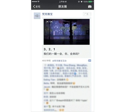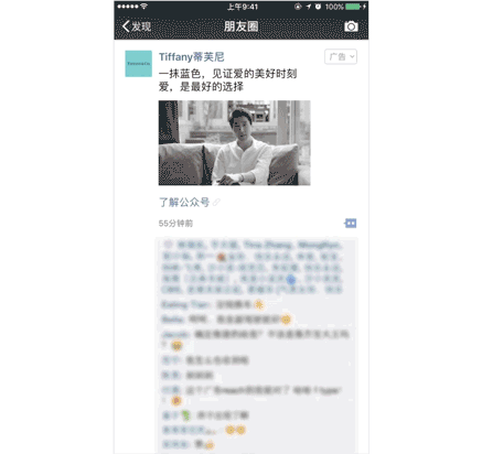 朋友圈原生推广页广告的强大承载力,让Tiffany能够以多种形式将品牌理念娓娓道来,“爱在此刻”、“陪伴是最温暖的承诺”等温情的文案,在视频和图片的映衬下显得具象而动人,即使在扎堆的情感鸡汤里也显得独树一帜。广告最后点击“关注Tiffany”跳转到品牌公众号页面,为品牌赢来了数万的新增粉丝。