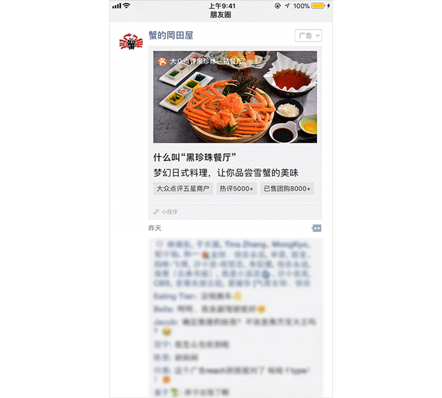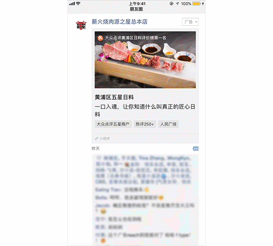 美团合作专属新形态广告展示 微信朋友圈广告与美团通过新的合作形式实现了1+1>2,让多方收益: 商户:美团平台和大众点评平台上的商户可以通过该样式,快速使用在上述平台运营已久的内容作为广告落地页,通过朋友圈广告高效地达成营销诉求。 平台:对于美团平台与大众点评平台来说,可以通过持续的品牌曝光塑造影响力。 用户:对于普通的微信用户,可在朋友圈获取到美团和大众点评优质的服务与内容。 薪火烧肉源之屋 薪火烧肉源之屋是上海南京东路的一家日料店,在大众点评平台上,他家的口味、环境、服务均受到五星好评,在黄浦区日料榜单排名第一,商家的用户热评数超过250条。在以往的营销中,他们希望能够将点评上的用户评价如实地呈现给新顾客面前,从而让用户愿意到门店尝试。 薪火烧肉源之屋广告示意 在新样式中,大众点评平台的榜单信息、商户评星、评论数均可以在广告外层展示,从而提升了用户的兴趣,吸引用户采取消费决策,并通过挖掘吃货饭友人群进行精准投放。 最终广告效果理想,点击率相比餐饮行业的普通卡片广告提升125%,点赞率为大盘餐饮广告行业均值3倍,评论率为大盘餐饮广告行业均值2.6倍。不少用户留下了“收藏,组团拔草约起来”、“第一名,好厉害,必须试一试”、“烤肉最爱,有人请客么”等正向评论。 蟹的岡田屋 蟹的岡田屋同样是大众点评平台上的五星商户,借助新样式,用户点击广告外层直接进入大众点评小程序的该商户详情页,可以查看用户评论、查看门店环境与菜品信息、消费单价,还可以提前预定座位、购买团购。 广告投放期间,广告的点击率高达5.64%,点赞率是大盘餐饮行业均值的6倍,评论率是大盘餐饮行业均值的2倍。 蟹的岡田屋广告示意 更多新样式问题欢迎咨询微信广告助手,在线客服会及时为您解答。 客服在线时间:工作日9:00-18:00 |