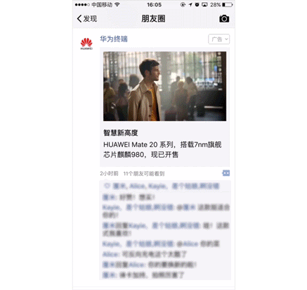 品牌官方区: 聚合品牌全入口,激活营销资源 品牌官方区以品牌关键词为触发机制。用户通过在微信“搜一搜”搜索关键词,触发品牌官方区直接展示在搜索下的专属区域。通过这项功能,用户能够更便捷地直达品牌提供的服务,也能更快、更直接地获取品牌信息与服务内容。 除品牌名称外,品牌还可结合营销需求设置个性化关键词,仿佛用暗号开启了品牌的隐藏关卡。 对广告主来说,“搜一搜”入口为品牌带来海量曝光的同时,也帮助广告主打通自线下到线上的流量转化通道,实现线上线下的跨渠道融合。此外,朋友圈广告的优质创意(广告推广页)可以在品牌官方区沉淀,小程序、公众号等营销资源得以集中整合呈现,帮助广告主构建从认知、信任到购买的营销闭环。 华为Mate20: 一站式模式助力新机上市 10月26日下午6点,华为最新机型Mate20在朋友圈正式发布。广告外层采用基础式卡片视频样式,并搭配“XX个朋友可能看到”功能以及最新上线的@好友评论互动功能,多重激发用户评论互动和社交分享兴趣。而内层原生推广页将新机四大核心卖点一一展现给用户,并可通过原生推广页按钮直接跳转至华为官方商城进行购买,建立起从新品认知到购买转化的营销闭环。该广告互动点击率超出行业均值120%,近3万用户主动转发分享,为新机带来了巨大的社交声量和曝光。 华为朋友圈广告示意 此外,华为充分运用品牌搜索的聚合能力打造了品牌官方区,用户只要搜索“华为” “华为终端” “HUAWEIMate20” “Mate20”等关键词,就能开启华为品牌官方区,既可选择观看发布会直播了解新机信息,或是阅读公众号深入了解品牌,也可直接进入小程序商城下单购买,一站式打造无断点体验。
