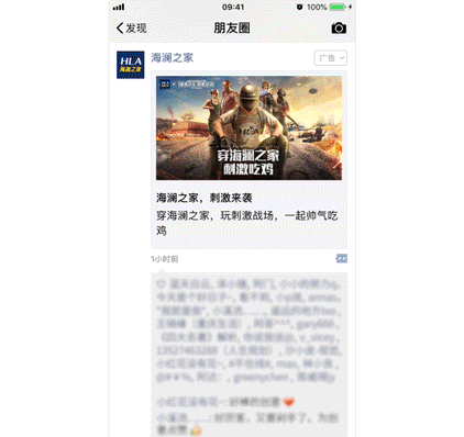 华为户外LED广告创意示意 微信朋友圈广告与品牌官方区的组合使用,不仅可以为品牌新品发布提供从曝光、转化到品牌资产沉淀的一站式解决方案,也适用于品牌在不同的营销需求和节点,放大营销资源价值。 海澜之家: 热门IP联动效应最大化 今年国庆长假期间,男装国民品牌海澜之家与腾讯旗下热门手游《绝地求生:刺激战场》强强联手探索跨界IP合作,开展了以“穿海澜之家,刺激吃鸡”为主题的联合营销活动。 一个是拥有广泛用户基础的“男人的衣柜”,一个是以男性为主要目标用户的热门手游,品牌与IP高度契合。朋友圈广告从外层到内层素材都紧扣IP联动主题,吸引品牌粉丝和游戏玩家亲身体验,广告收获超过3亿曝光。 海澜之家朋友圈广告示意 同时,配合品牌官方区,除了常规的公众号和小程序入口,更有“刺激吃鸡”选项,点击后可进入朋友圈广告原生落地页,使IP影响力直达用户。除了“海澜之家”关键词之外,活动期间当用户搜索“吃鸡”时就会进入海澜之家品牌官方区,日均亿级的搜索量使IP联动效应实现最大化。 与此同时,海澜之家线下4500多家主力门店的收银台前均长期放置活动相关宣传物料,引导线下目标用户上微信“搜一搜”搜索关键词,实现全线联动,也使“搜一搜”成为品牌长期与用户沟通的联络点。
