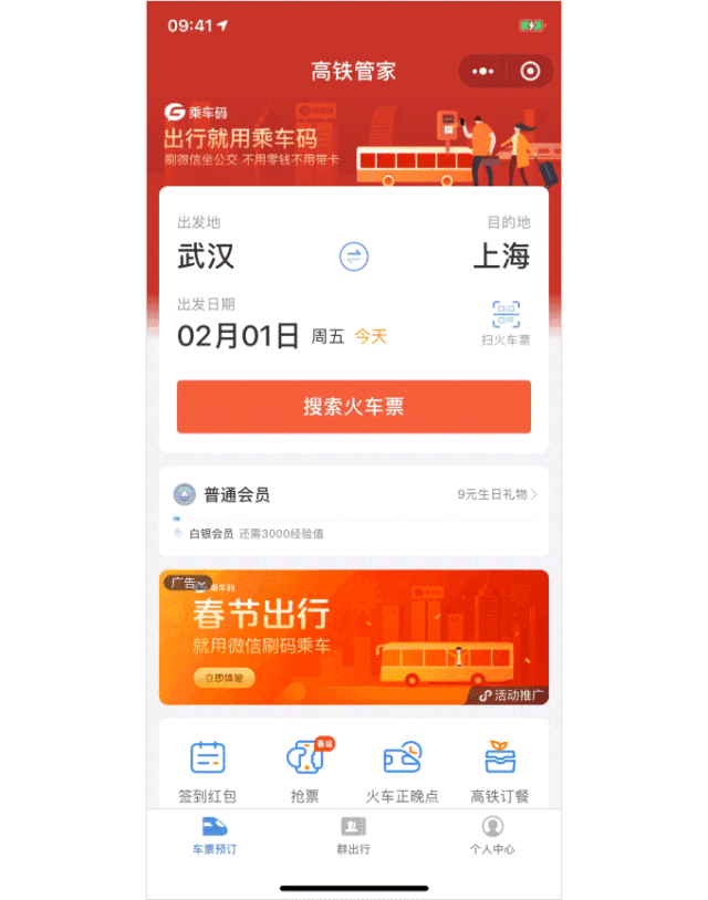 高铁管家互选定制广告示意 在春节互选定制广告中,乘车码采用了定制春节皮肤、品牌元素植入、分享卡片等多种广告形态,每种形态不再拘泥于特定广告位,而是巧妙与场景融为一体,比如在春节皮肤中植入品牌色调、将品牌logo植入个人中心界面等。在进行年味互动的同时,也带来更沉浸的视觉感受和使用体验。