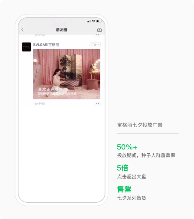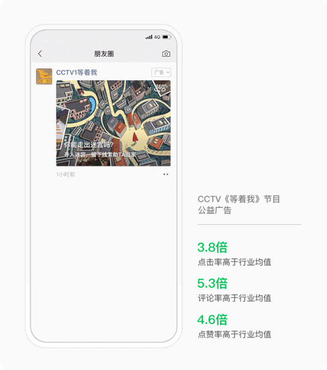 微信朋友圈合约广告升级,精细化满足多维营销需求-绍兴网络公司为你呈现时间:2020-08-22 让每个TA为你的品牌代言 “长效社交”模式的原理为:广告投放前期,系统优先为客户选择高匹配人群作为种子人群投放,随后利用升级后的算法,更全更准的扩散触达更多潜客。广告在线7-30天,期间,算法不断调优,最终收获更好的广告效果及社交影响力,平台样本数据显示,使用长效社交模式投放的广告较使用前点击率可提升80%以上。 为品牌提供朋友圈KOC库 现今消费者愈发理智,“种草拔草”文化盛行,熟人推荐对消费者影响重大。事实上,每个品牌都拥有一定数量的忠实拥趸。如何能够找到并利用这些用户为自己的品牌“代言打call”?为解决这个难点,微信广告利用平台数据资产,优化算法,提升种子人群质量,并将广告优先投放给种子人群,充分调动种子人群的强分享意愿和品牌忠诚度,打造第一批“种草互动”。 ![]() 广告互动效果大大提升 ![]() 数据来源:平台测试数据 此外,“长效社交”模式填补了长效互动型广告产品的需求缺口。广告下互动内容为用户自发产生,更高频(样本数据显示,“长效社交”模式下用户的互动次数较大盘高18%),共鸣感更强,较长的投放周期(7-30天)也为广告提供了长线匀速释放预算的空间。 央视公益节目《等着我》投放朋友圈广告。长效社交模式提升了广告的点击表现及互动次数,广告热度爆棚。 全链路多目标支持 本次朋友圈品牌合约广告升级,打造投放模式矩阵(限时推广、常规合约、长效社交),可实现投放时长全覆盖、形态落地页全覆盖、效能最大化。